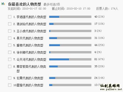 你最希望仙剑5中出现哪种类型的人物?仙剑五官方博客发起投票,选出你心目中希望在仙剑五中出现的人物类型,并会对投票结果作出游戏角色调整参考。投票自2010年01年17日 02:00起,到2010年02年10日 17:00结束,请大家为自己喜欢的角色类型投上神圣一票。