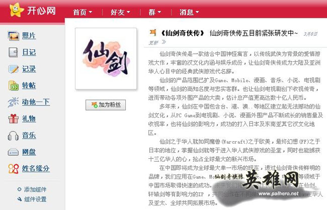 《仙剑奇侠传》入驻开心网(http://www.kaixin001.com),将在开心网与玩家近距离接触。玩家可在开心网与《仙剑奇侠传》加为好友,更近距离关注仙剑动态。
