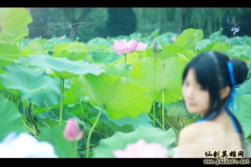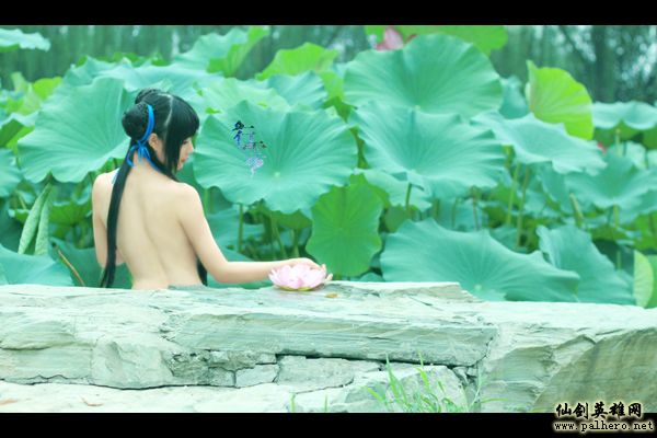 图片中,coser梳着古代少女的“包子头”,全身赤裸,在一片荷花中以背部示人,做欣欣然出浴状。玩过《仙剑奇侠传》的朋友都知道,这是仙剑中赵灵儿荷塘沐浴的经典桥段,她就是在这里邂逅男主角李逍遥,从此开始了一段凄美动人的故事。