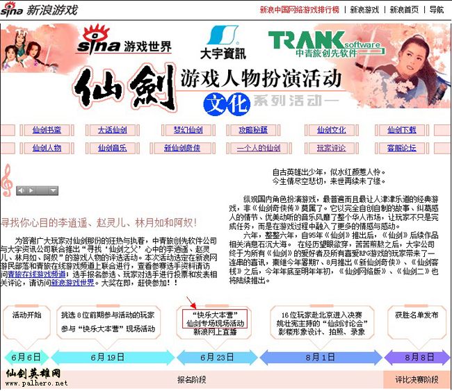 2002年,新浪游戏与大宇资讯、中青旅创先软件合作举办了“仙剑游戏人物扮演活动”,该活动网址至今依然可以访问:http://games.sina.com.cn/zhuanqu/pal/。活动第二阶段将选出8位参赛者参加“快乐大本营”仙剑专场活动,相信很多朋友没看过这场快乐大本营,以下为该场快乐大本营视频。
