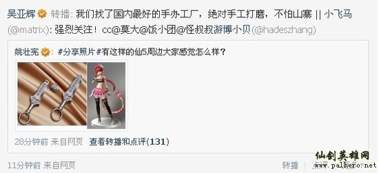 虽然百游高级副总裁魏啸在微博中“惊呼”姚仙为何“开完会就曝光”游戏周边,但这是否可能是一起炒作呢?提前公布周边,是否会引来一波仙剑五周边山寨潮?