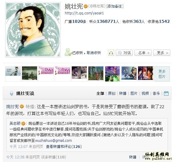 书还没动笔前,姚仙希望广大玩家一起参与,向广大网友征集问题,姚仙会从中选取一些经典问题收录在书中进行解答。提问范围包括:关于仙剑游戏,姚仙个人成长经历,中国单机游戏产业现状,中国游戏文化等等(谢绝八卦以及个人隐私的问题),提问可在本文留言(仙剑英雄网为您转达)或发邮件至[email protected]。