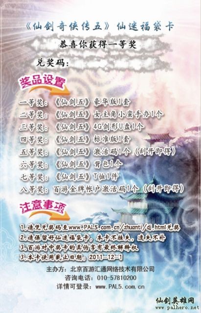 今日为大家公布《仙剑奇侠传5》实体标准版中尚未公布的“仙迷福袋卡”。仙迷福袋卡是百游特意为支持仙剑的朋友们准备的一个小小惊喜。玩家购买到首批实物标准版即可获得该卡,刮开密码涂层后即可看到赠送礼品内容。