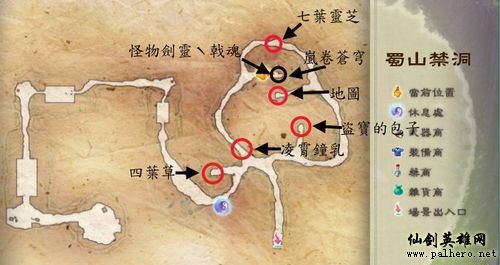 ▼这是蜀山禁洞的详细地图,是以游戏中的为例,跟攻略上的方向不同,这么密技的首要条件,就是到剑灵ˋ戟魂跟岚卷苍穹的那个黑圈圈中。