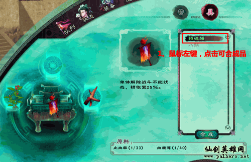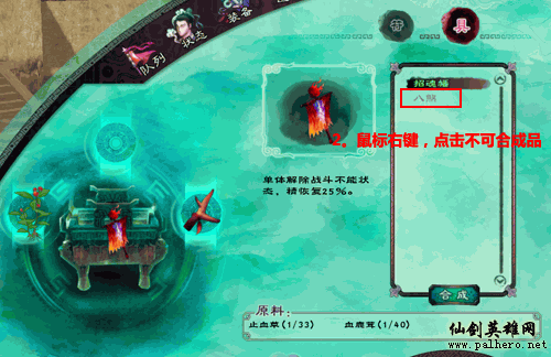 《仙剑奇侠传五》合成系统允许玩家在学习合成技能后,在指定原料充足的情况下将原料合成道具或咒符的系统。但该系统有BUG,可以实现原料不足的情况下照样合成道具,具体操作如下: