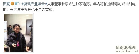 2012年1月9日,2011年度中国游戏产业年会正式在西安开幕,国内多家游戏公司高层共聚一堂,因而也常常会有一些报消息曝光出来。前大众软件编辑部主任田震爆料,据大宇董事长李永进爆料:年内或将筹拍仙剑或轩辕剑的电影。