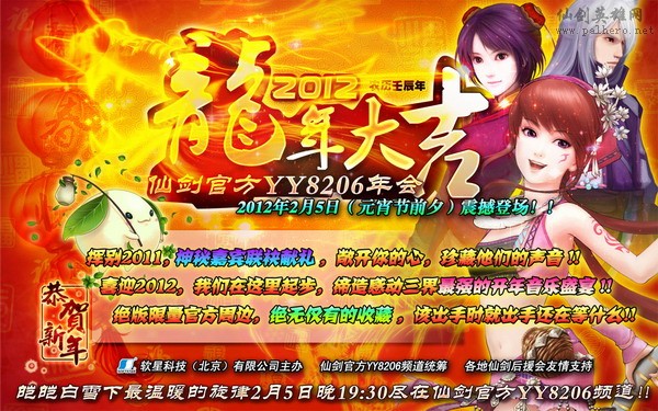 元宵节将至,仙剑官方YY8206年会也将随之拉开帷幕,晚会定于2012年2月5日晚19:30分开场,由软星科技(北京)有限公司主办,仙剑官方YY8206频道统筹,仙剑各地后援会友情支持等联合举办这次开年音乐盛宴晚会,精心筛选和准备的节目让您耳目一新,众多神秘嘉宾到场和仙迷精彩互动,让您近距离接触心目中的偶像,绝版限量官方周边为您送出新年大礼,满足您的收藏欲望。周边部分名称(仙剑奇侠传系列绢丝挂轴、仙剑五水晶版画、逍遥游明信片等)。感谢大家一直对仙剑的支持,谨此晚会感谢所有支持仙剑的玩家,祝大家在新的一年里“龙马精神”、“心想事成”、“财源广进”。皑皑白雪下最温暖的旋律2月5日晚19:30分尽在仙剑官方YY8206频道,盛大音乐盛宴让您重温那段感动。