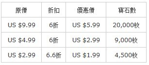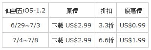 仙剑五iOS-1.2上市拚人气,号召粉丝大集合!三天!三天!只有三天!在6/29-7/1期间,仙剑粉丝揪团相挺下载,只要将仙剑五iOS-1.2推上中国大陆、台湾、香港任一地区APP Store游戏排行榜前五名,大宇信息立即加码延长US$ 0.99促销三天(7/4-7/6优惠价从US$1.99调整为US$0.99),并于7/6-7/8期间,连续三天推出IAP限时降价好康活动,回馈广大仙剑五iOS玩家的支持。限时降价内容详见下方表格: