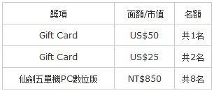 谁最猛?仙剑五iOS-1.2争霸战将于6/29~7/16期间展开厮杀!7/18公布比赛结果,成绩以Game Center成绩排名为标准,分数排名前3名,可获得APP Store的Gift Card,第4-11名可获得仙剑五单机PC数位版。仙五iOS奖项详见下方表格: