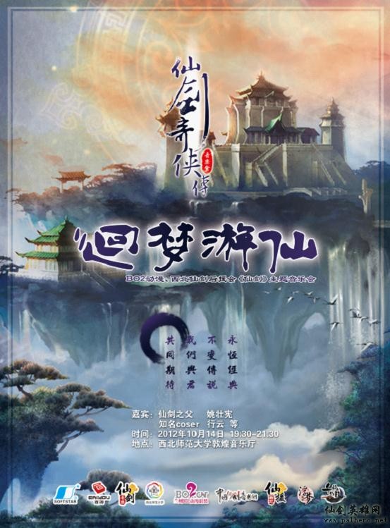 为了感谢广大仙迷一直以来的大力支持,兰州BO2动漫联盟联合仙剑西北后援会将于2012年10月14日晚 7:30 举办“回梦游仙”第二届《仙剑奇侠传》主题音乐会,届时,仙剑之父“姚壮宪”、知名coser行云等嘉宾将亲临助阵,国产动漫游戏研讨会、古风同人展,三大活动也将为您呈现更多精彩。